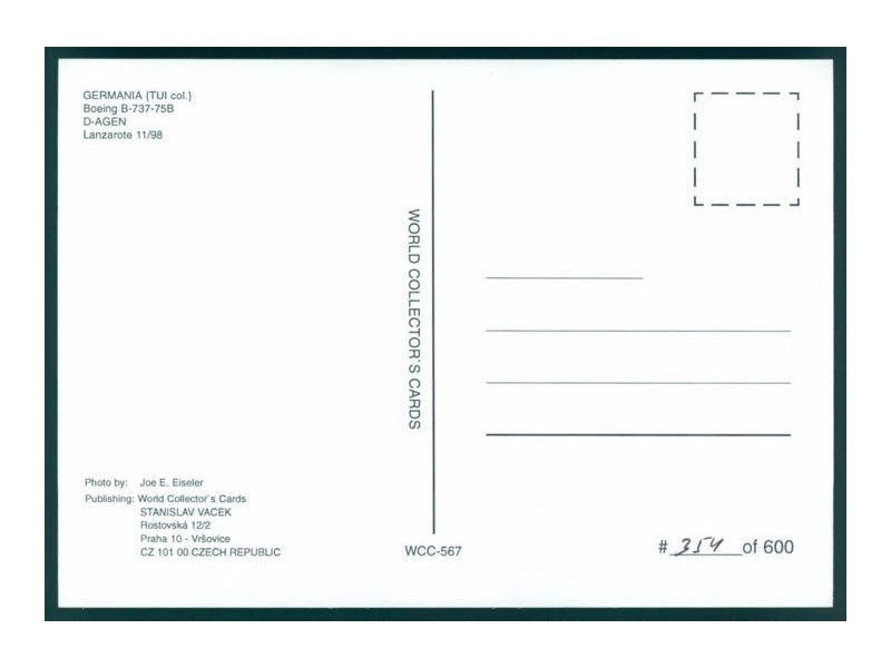 Airline Issue; 5.8''x4.1'' (148x105 mm); mint